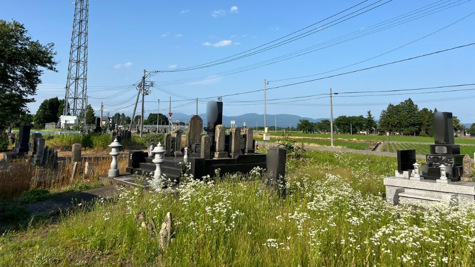 緑豊かな田園に囲まれた静かな環境で、周囲には季節の野花が咲き、温かみのある地域の雰囲気が漂う墓地です。
